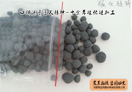 用碳化硅球团代替硅铁脱氧的技术(主要是碳化硅从价格,含量,质量,使用方法方面都有很大的市场发展空间)。不仅从含量,吸收溶解效率,净化钢液效果,价格方面,硬度方面都有不错的市场基础。另一方面由于钢厂所采购的碳化硅颗粒主要以:0-10mm规格居多,在炼钢高炉的下料当中粉尘较大且损失率较高,而且吸收率较低。而制成碳化硅球后加入新的配方配比吸收率及使用率均有明显的改善。